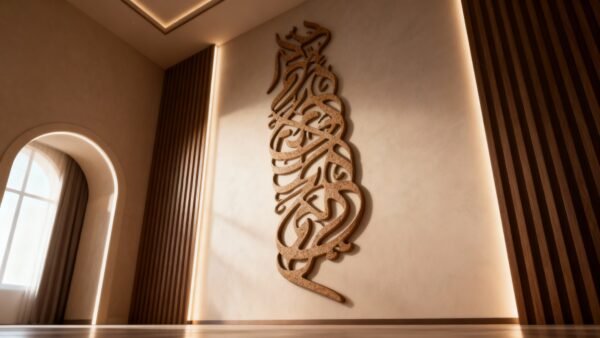 Islamic wall art is a visually captivating form of decoration deeply rooted in Islamic culture and art traditions. It often features intricate geometric patterns, Arabic calligraphy, floral motifs, and arabesque designs, which are all intended to create an atmosphere of reflection, harmony, and beauty. The art commonly avoids depictions of living beings to adhere to Islamic teachings, focusing instead on the beauty of abstract forms and script.